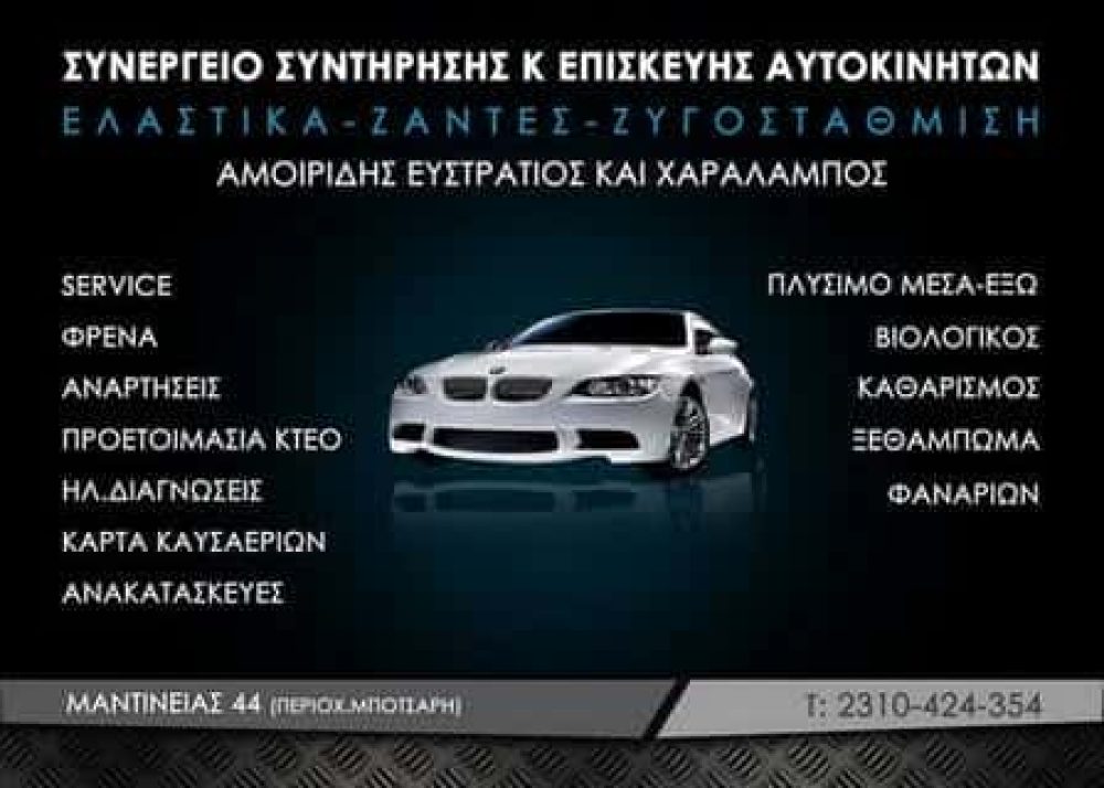 ΣΥΝΕΡΓΕΙΑ ΑΥΤΟΚΙΝΗΤΩΝ ΣΤΗ ΘΕΣΣΑΛΟΝΙΚΗ – ΒΟΥΛΚΑΝΙΖΑΤΕΡ ΣΤΗ ΘΕΣΣΑΛΟΝΙΚΗ – ΕΠΙΣΚΕΥΕΣ ΑΥΤΟΚΙΝΗΤΩΝ ΣΤΗ ΘΕΣΣΑΛΟΝΙΚΗ – ΑΛΛΑΓΕΣ ΛΑΔΙΩΝ ΣΤΗ ΘΕΣΣΑΛΟΝΙΚΗ, ΣΥΝΤΗΡΗΣΗ ΚΑΙ ΕΠΙΣΕΚΥΕΣ ΠΑΝΤΟΣ ΤΥΠΟΥ ΑΥΤΟΚΙΝΗΤΩΝ, ΣΥΝΕΡΓΕΙΟ ΑΥΤΥΟΚΙΝΗΤΩΝ ΒΡΥΣΑΚΙ ΘΕΣΣΑΛΟΝΙΚΗΣ, ΕΠΙΣΚΕΥΗ ΑΥΤΟΚΙΝΗΤΩΝ ΒΡΥΣΑΚΙ ΘΕΣΣΑΛΟΝΙΚΗΣ, SERVICE ΑΥΤΟΚΙΝΗΤΩΝ ΒΡΥΣΑΚΙ ΘΕΣΣΑΛΟΝΙΚΗΣ, ΣΥΝΤΗΡΗΣΗ ΑΥΤΟΚΙΝΗΤΩΝ ΒΡΥΣΑΚΙ ΘΕΣΣΑΛΟΝΙΚΗΣ , ΦΡΕΝΑ ΒΡΥΣΑΚΙ ΘΕΣΣΑΛΟΝΙΚΗΣ, ΑΝΑΡΤΗΣΕΙΣ ΒΡΥΣΑΚΙ ΘΕΣΣΑΛΟΝΙΚΗΣ, ΑΝΑΚΑΤΑΣΚΕΥΕΣ ΒΡΥΣΑΚΙ ΘΕΣΣΑΛΟΝΙΚΗΣ, ΕΛΑΣΤΙΚΑ ΒΡΥΣΑΚΙ ΘΕΣΣΑΛΟΝΙΚΗΣ, ΖΑΝΤΕΣ ΒΡΥΣΑΚΙ ΘΕΣΣΑΛΟΝΙΚΗΣ, ΒΟΥΛΚΑΝΙΖΑΤΕΡ ΒΡΥΣΑΚΙ, ΘΕΣΣΑΛΟΝΙΚΗΣ, ΖΥΓΟΣΤΑΘΜΙΣΗ ΒΡΥΣΑΚΙ ΘΕΣΣΑΛΟΝΙΚΗΣ, ΠΡΟΕΤΟΙΜΑΣΙΑ ΚΤΕΟ ΒΡΥΣΑΚΙ ΘΕΣΣΑΛΟΝΙΚΗΣ, ΚΑΡΤΑ ΚΑΥΣΑΕΡΙΩΝ ΒΡΥΣΑΚΙ ΘΕΣΣΑΛΟΝΙΚΗΣ, ΗΛΕΚΤΡΟΝΙΚΕΣ ΔΙΑΓΝΩΣΕΙΣ ΒΡΥΣΑΚΙ ΘΕΣΣΑΛΟΝΙΚΗΣ