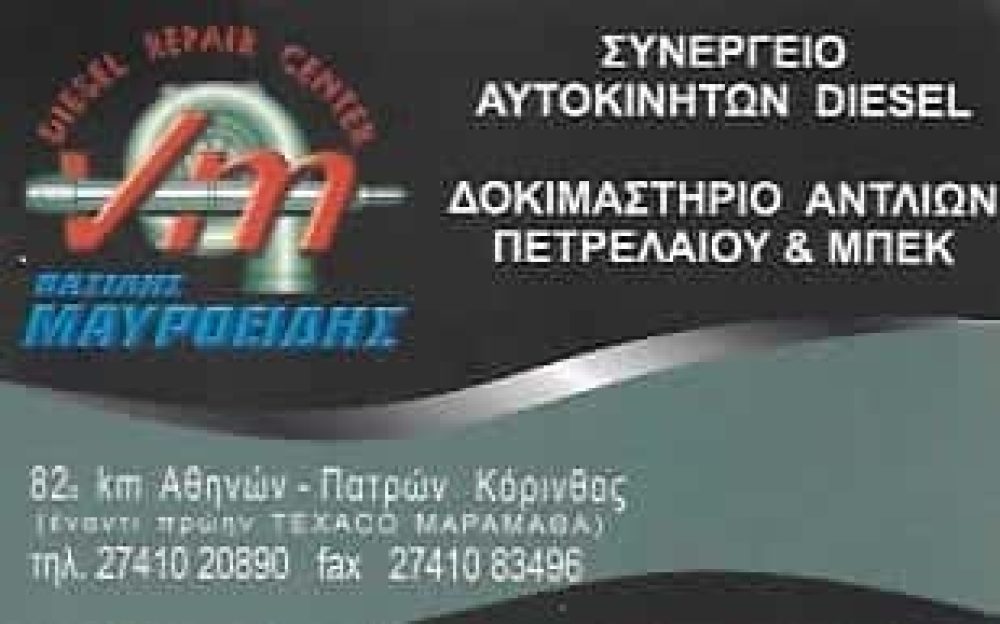 Το συνεργείο αυτοκινήτων Diesel του Μαυροειδή Γεώργιου βρίσκεται στο 82ο χλμ. Εθνικής Οδού Αθηνών – Κορίνθου. Το εξειδικευμένο προσωπικό μας μπορεί να δώσει λύση σε κάθε σας πρόβλημα. Αναλαμβάνουμε επισκευές και βελτιώσεις κινητήρων Diesel, δοκιμή αντλιών πετρελαίου και μπέκ, επισκευές και ρυθμίσεις turbo κ.α. Ελάτε σε εμάς για ένα γρήγορο και επαγγελματικό αποτέλεσμα.